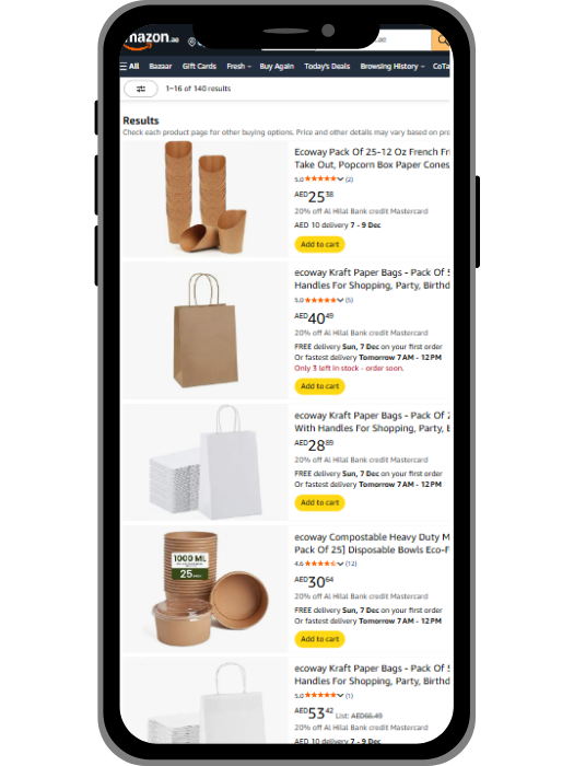 Brand partnered with GrowithAmazon for complete marketplace onboarding across Amazon UAE, USA, and KSA, along with expansion into Noon and their own B2C/B2B e-commerce website. As a regional pioneer in biodegradable disposable products, Brand required a multi-market launch strategy backed by strong brand positioning, optimized visibility, and scalable advertising performance.